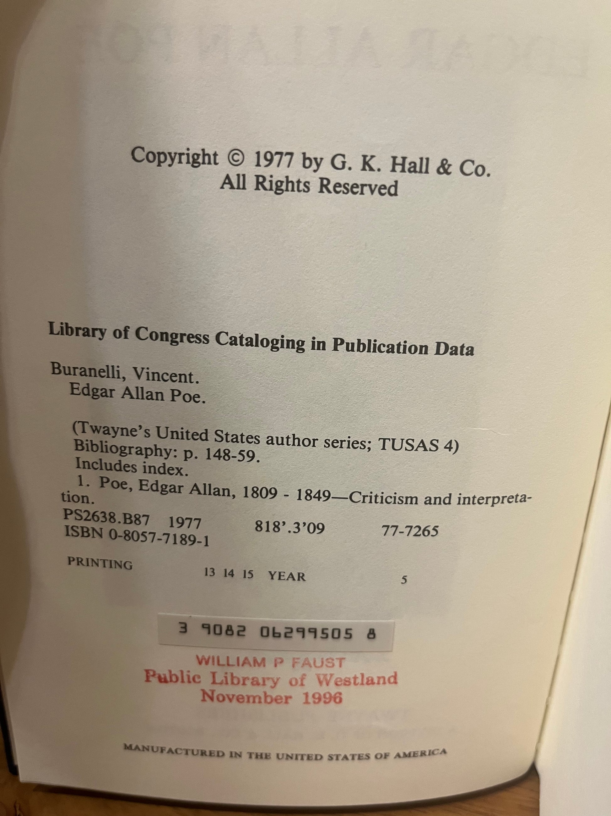 Literary criticism of Poe’s work from the 1970s. Former library copy